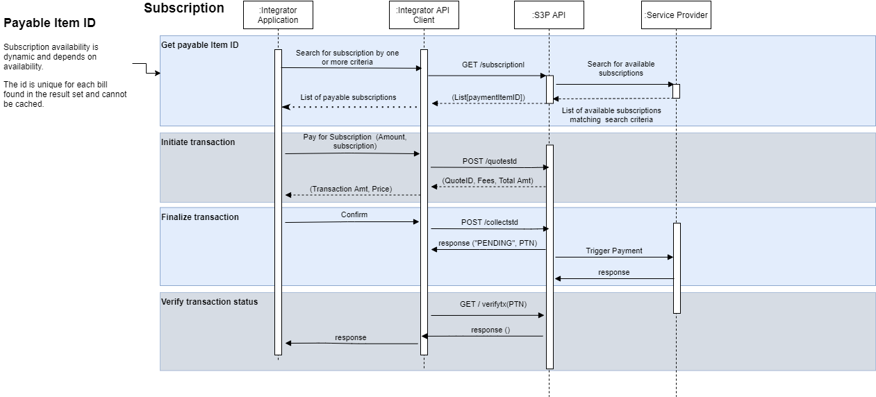 Subscription payments are similar to bill payments, except that there are no bills returned in the search results. These are payable items referring with a direct reference to an account/customer registered with the subscription provider without a direct payment obligation.